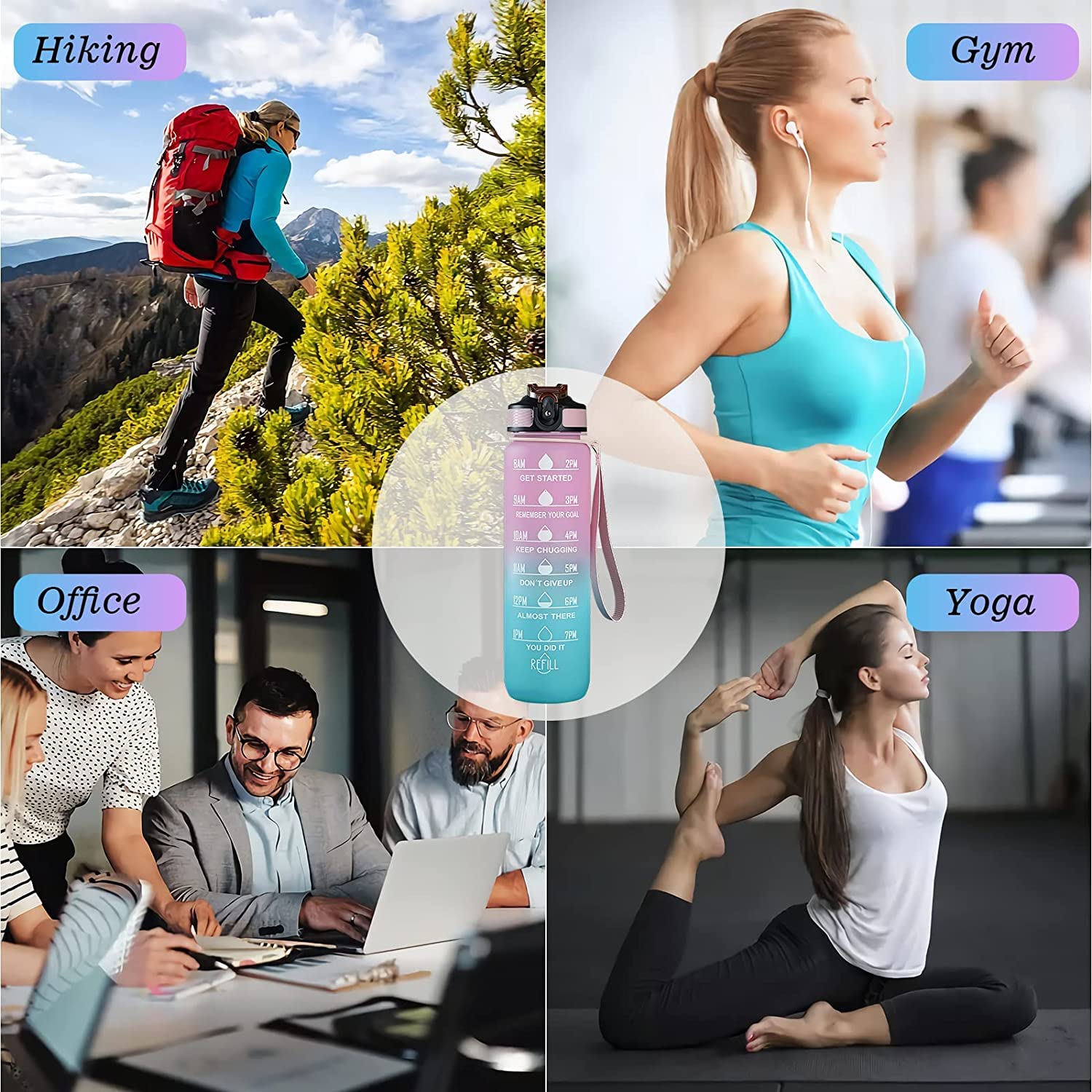 Motivational Quote & Time Marker 32 oz water bottle with unique inspiration quote and time marker, reminding you to stay hydrated. The capacity marker helps you tracking daily water intake.