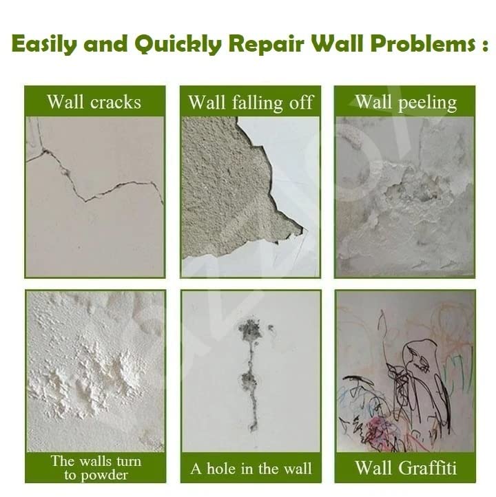 WIDELY USED: Wall mending agent is perfect for repairing cracks, nail holes, holes, peeling walls, graffiti and stains on walls. Can easily solve wall damage problems in homes, schools and offices. Perfect for small repair projects. Wall hole filler cannot use for wet wall, mortar off powder wall, uncleaned damaged wall, etc.